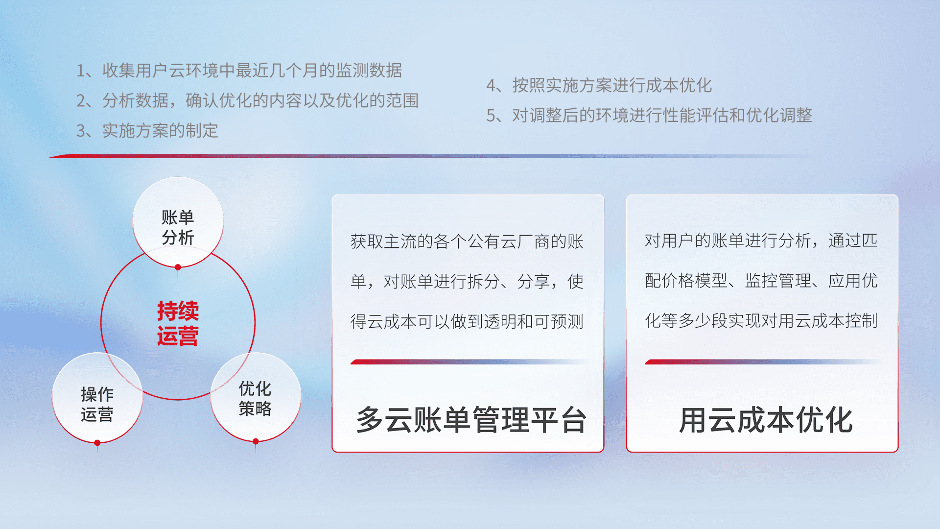 通过多云纳管,,,以统一的资源数据模型把客户的云资源进行抽象和封装,,,,进而实现对多云资源的统一操作,,,保障云资源管理的可靠性、、、稳定性与可用性。。量身定制化运维内容,,,配置、、、、开发运维、、补丁管理、、备份、、、监控、、认证和访问管理、、、、审计和日常巡检等,,,保障在用云过程中的可靠度,,,,稳定度以及高可用率。。。。