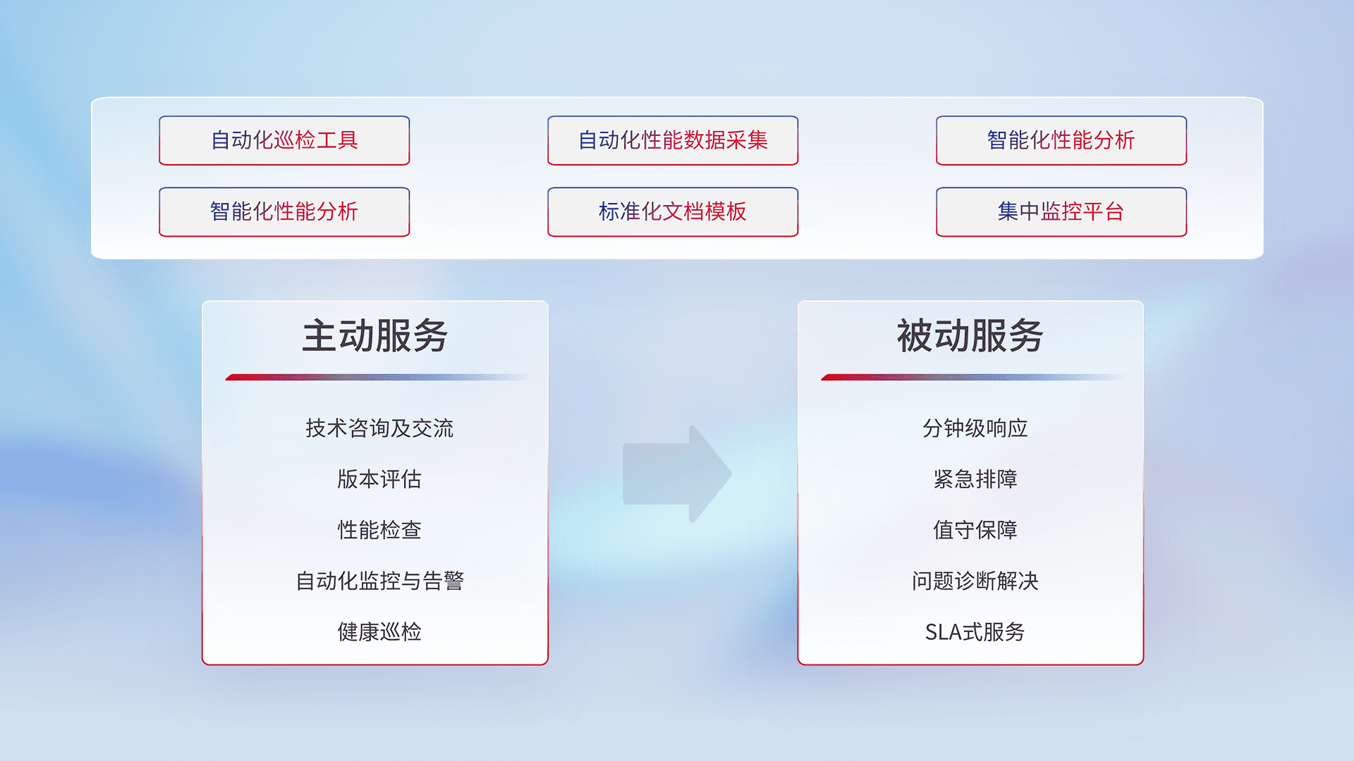 智能化工具和标准化文档,,,,保障服务质量,,,,提供主动服务(包含技术咨询、、、、版本评估、、、、性能检查、、、自动化监控与告警、、健康巡检)和被动服务包含(分钟级响应、、、、紧急排障、、、、值守保障、、、、问题诊断解决、、、、SLA服务)。。。。